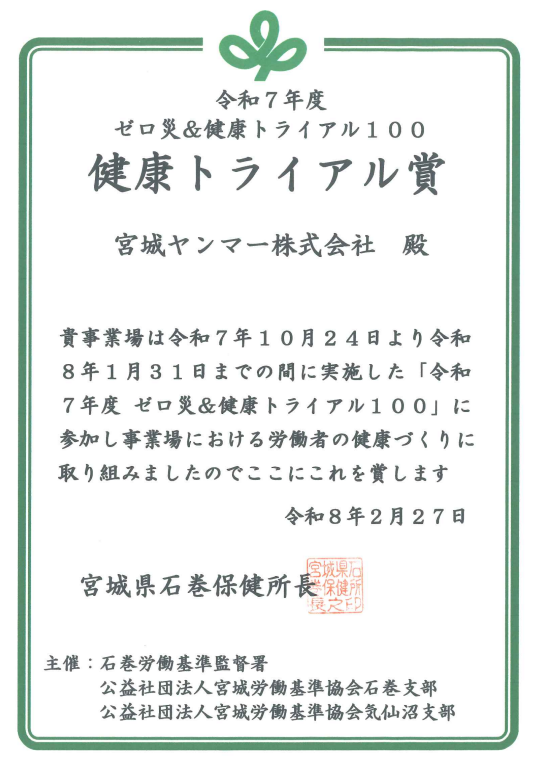 転倒災害防止目標を立て、令和7年度ゼロ災&健康トライアル100の取り組みに参加し「ゼロ災達成証」を、また毎日のラジオ体操と血圧チェックの継続により「健康トライアル賞」をいただいております。