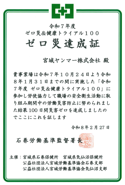 転倒災害防止目標を立て、令和7年度ゼロ災&健康トライアル100の取り組みに参加し「ゼロ災達成証」を、また毎日のラジオ体操と血圧チェックの継続により「健康トライアル賞」をいただいております。